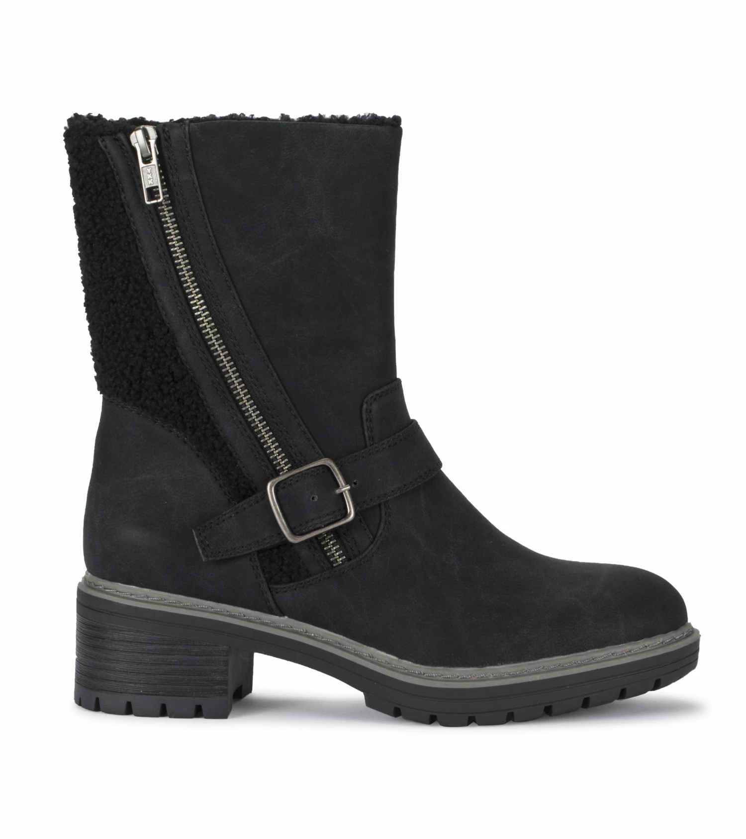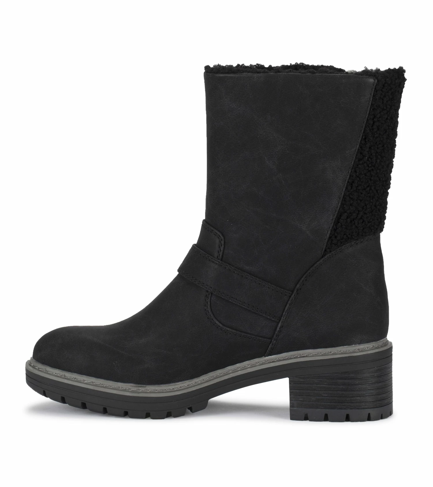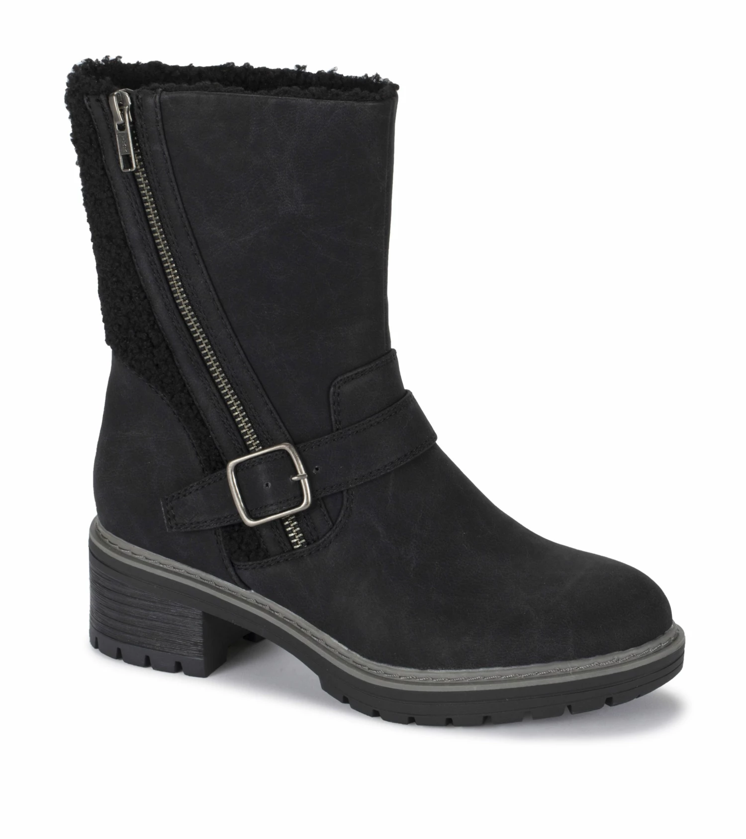 Step out in confidence in a fashionable lug boot that is warm and comfortable. The Baretraps Alary 3/4 boot features a sturdy lugged sole, fashionable metal buckle detail with a zippered side entry and a warm faux fur lining.